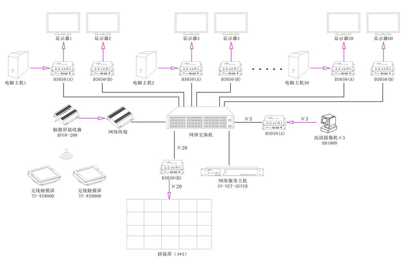 4.2、 二樓指揮中心采用由20塊46英寸3.5mm超窄拚縫的高清液晶顯示單元(D5001)組成的拚接牆作現場大屏顯示,另外每個工作人員席位均設計了2台液晶顯示屏,1台作本地電腦畫麵顯示,另外1台作外部分布式信號接入顯示,係統拓撲圖如下: